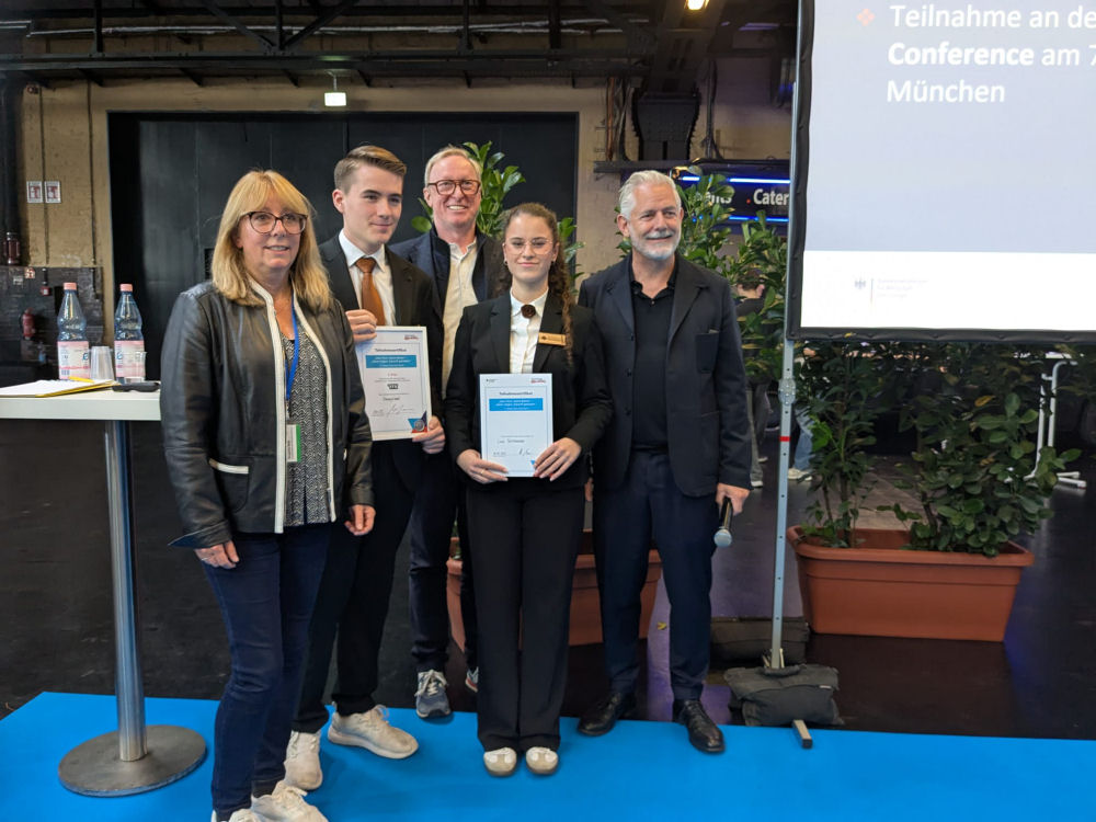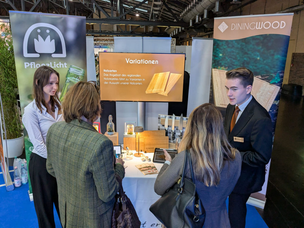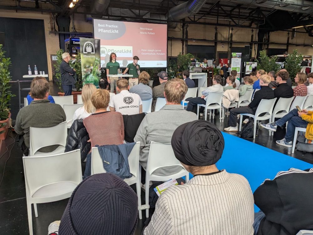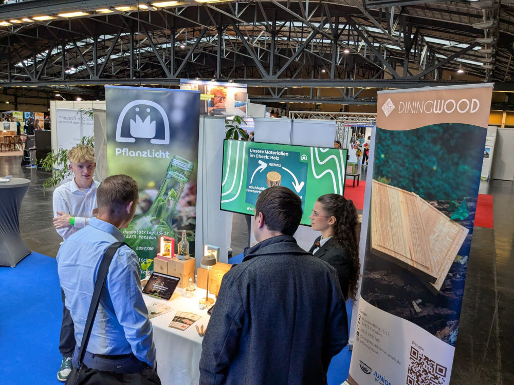 der größten Gründungsmesse in Deutschland ein Pitch-Event mit deutschlandweit angereisten Schülerfirmen. So fand am 11. Oktober 2025 auf dem Forum des Bundesministeriums für Wirtschaft und Energie (BMWE) in der Arena Berlin jeweils eine 3-minütige Firmenvorstellung gefolgt von einer 5-minütigen Jury-Fragerunde statt. Die beiden JUNIOR-Unternehmen DiningWood und PflanzLicht waren mit Tatiana und Leon sowie Bea und Bruno bereits seit dem 10. Oktober mit einem eigenen Messestand vor Ort, so dass eine Teilnahme nahe lag. Moritz und Nico von PflanzLicht erklärten sich zusätzlich bereit, während der Jurysitzung das Auditorium in ca. 30 Minuten über ihre Geschäftsidee und deren Umsetzung, aber auch über Erfolge und Baustellen zu informieren sowie Publikumsfragen zu beantworten.