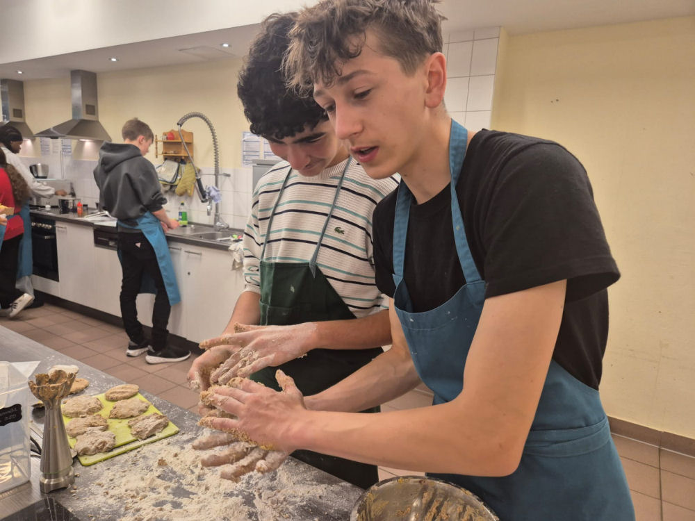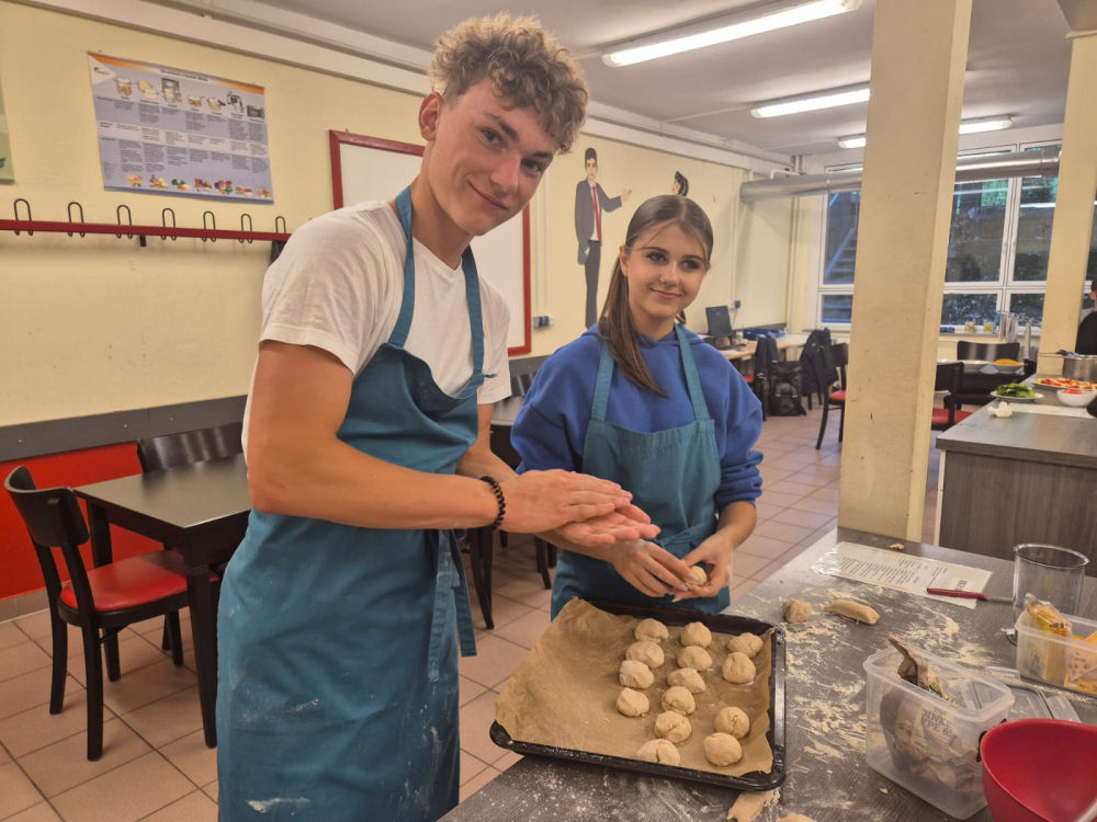 täglich in ein kleines Restaurant: Jede achte Klasse durfte gemeinsam mit zwei WAT-Lehrkräften ihr Schuljahr mit einem besonderen Abschlusskochen ausklingen lassen. Auf dem abwechslungsreichen Speiseplan standen dieses Jahr Infused Water, (Veggie-)Burger mit Beilagen und selbstgemachten Brötchen, Coleslaw, Hähnchennuggets und Nudelsalat. Als süßer Abschluss wurden schokolierte Obstspieße, Eierkuchen und eine cremige Quarkspeise zubereitet. Gekocht wurde in Teams – mit viel Engagement, Kreativität und natürlich jeder Menge Spaß. Nach dem gemeinsamen Essen wurde selbstverständlich auch abgewaschen und die Küche aufgeräumt.