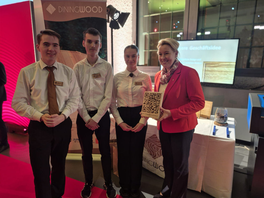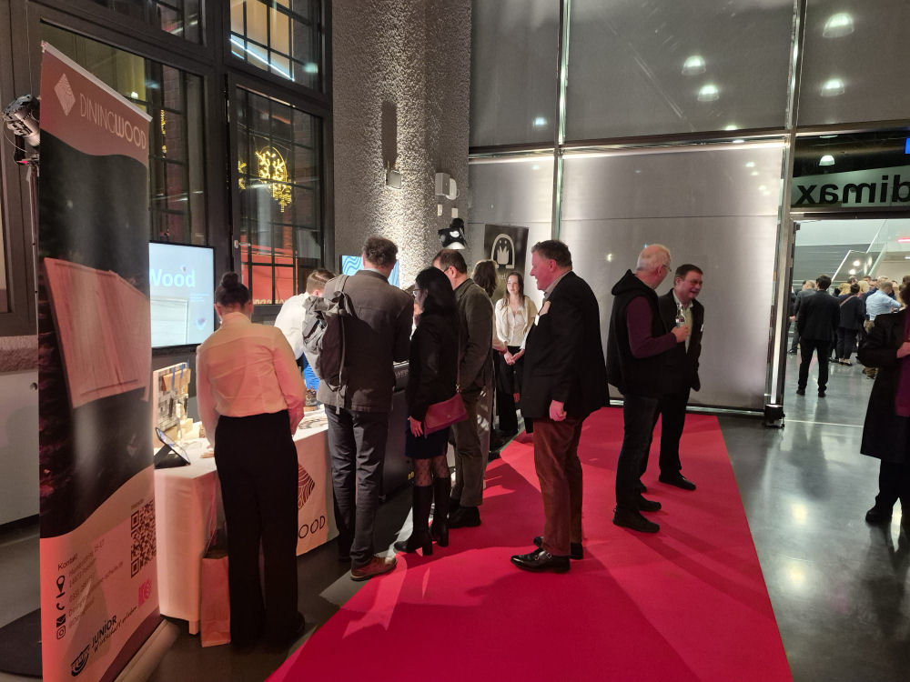 fand in diesem Jahr in den Räumlichkeiten der TH Wildau statt. Wiederholt fanden es die Veranstalter in den letzten Jahren passend, junge, innovative UnternehmerInnen als Aussteller ihrer Ideen einzuladen. So konnten am Abend des 28. November 2025 Leon, Tatiana, Josephine und Justus das JUNIOR-Unternehmen DiningWood sowie Moritz, Bea, Lena und Tristan (v.l.) das JUNIOR-Unternehmen PflanzLicht den geladenen Gästen präsentieren. Beide Messestände wurden durch den Lasercutter verbunden, der als besondere Aktion an diesem Abend dafür sorgte, dass die Gäste sich individuell gravierte Kugelschreiber mitnehmen konnten.