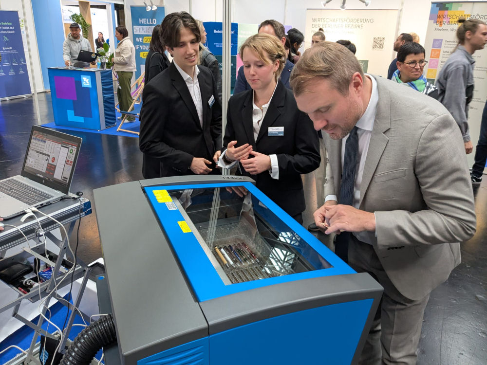 Besondere Wertschätzung erhielten die SchülerInnen am ersten Tag, als sich der Wirtschaftsminister des Landes Brandenburg aus ganz privatem Interesse in ein ausführliches Gespräch begab. Aber auch Herr Bothe, Leiter der Servicestelle Schülerfirmen, sowie Asli Karabenli, Leiterin des JUNIOR-Hauptstadtbüros, nahmen sich ausführlich Zeit, um sich über aktuelle Entwicklungen in der nun 19 Jahre bestehenden Schülerfirma zu erkundigen.