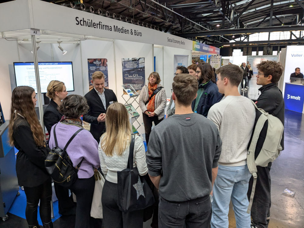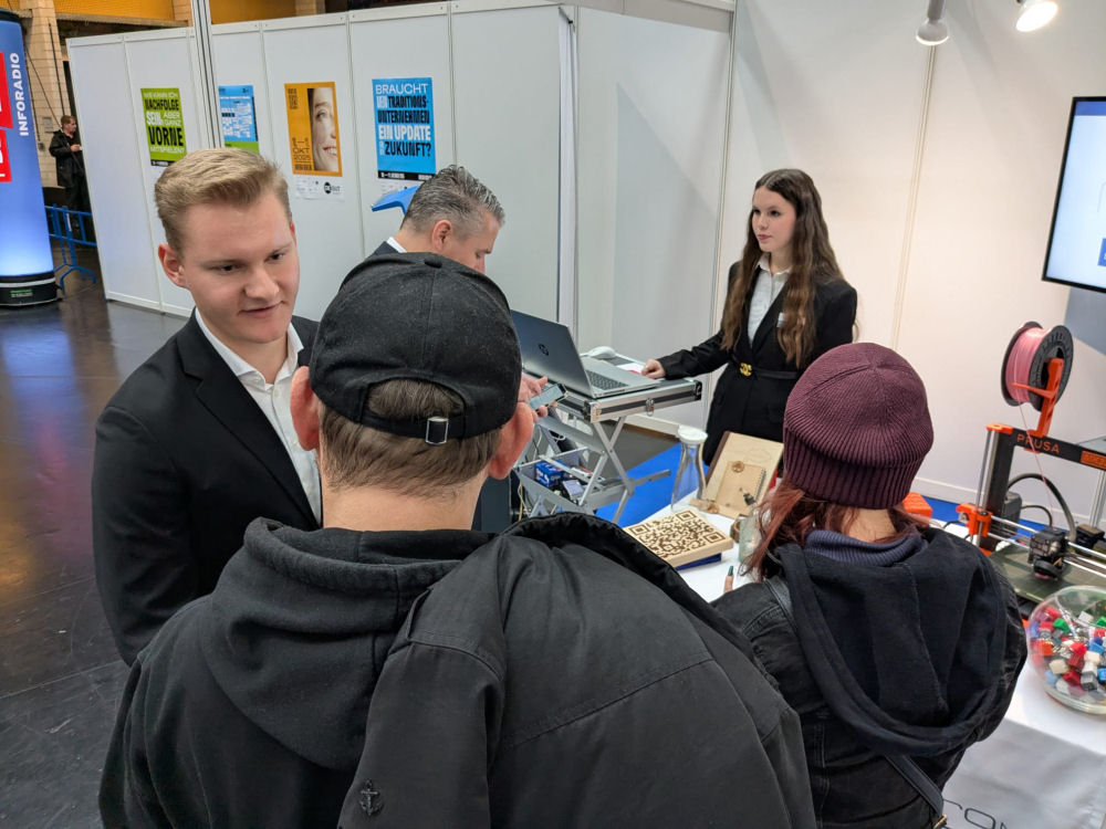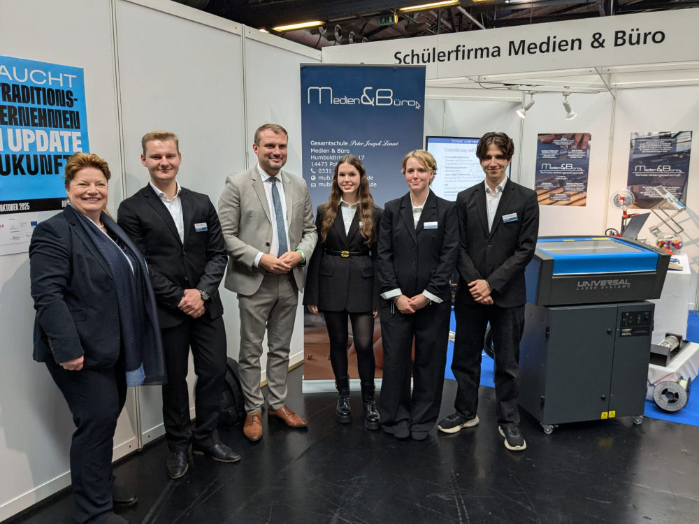 nun bereits zum 17. Mal die Schülerfirma Medien & Büro auf der größten Gründer- und Unternehmermesse Deutschlands präsentieren. In der Arena Berlin erläuterten sie den BesucherInnen, was eine Schülerfirma ist und was sie leisten kann. Speziell wurden Leistungen rund um den Lasercutter und die 3D-Drucker an Beispielen beschrieben - teils sogar in englischen Sprache. Dabei wurden innerhalb von Live-Produktionen Kugelschreiber graviert und nachhaltige Schlüsselanhänger gedruckt.