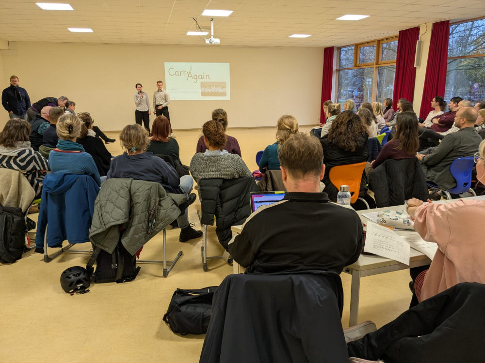 Nach nun 10-wöchiger harter, aber total spannender Arbeit waren nicht nur genügend Produkte, sondern auch das gesamte PR-Material fertig. Zeit also, sich bei der gesamten Lehrerschaft einmal vorzustellen. Gesagt - getan. Am 19. November konnten Pauline und Daniel das junge Unternehmen mit einer kurzen Präsentation vorstellen. Parallel dazu erklärten Neele und Nele an einem Messestand den Produktionsprozess und diskutierten mit den LehrerInnen über weitere Taschenvarianten.