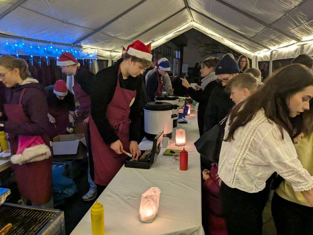 Dazu hatten gut 10 Projekte einen Verkaufsstand in der Mensa aufgebaut. Parallel dazu stellten sich die JUNIOR-Unternehmen CarryAgain, DiningWood und PflanzLicht den SchülerInnen, Eltern und LehrerInnen, aber auch ehemaligen SchülerInnen und LehrerInnen vor. Auf der Bühne unterstrichen SchülerInnen und LehrerInnen mit mehreren musikalischen Beiträgen die weihnachtliche Atmosphäre. Bei nicht ganz idealem, regnerischem Wetter konnten alle Gäste im Außenbereich mit einem vielseitigen Catering zu wirklich moderaten Preisen versorgt werden.