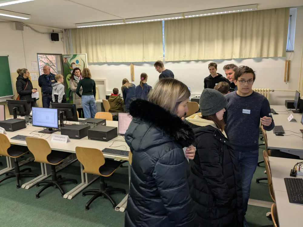 Dieses intensive Miteinander, die breitgefächerten Projekte sowie die unterrichtliche Ausrichtung präsentierten an diesem Tag Lehrkräfte mit tatkräftiger Unterstützung wirklich vieler Lernenden. Bereits im Foyer zeigten verschiedene Schülerfirmen ihre Leistungsfähigkeit. In den Fachbereichen wurden Unterrichtsinhalte und zugehörige Projekte visualisiert - im letzten Foto ist das hohe Interesse am Profilfach Informatik deutlich ersichtlich. Parallel dazu führte der Schulleiter, Herr Dr. Stephan, und der Oberstufenkoordinator, Herr Probst, Informationsrunden rund um den Ü7- und den Ü11-Übergang durch.