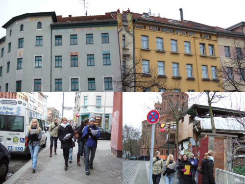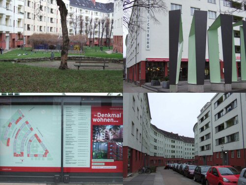In Kreuzbergs ältester Geschäftsstraße befindet sich der Oranienhof, in dem sich sowohl produzierendes Gewerbe als auch verschiedene Dienstleistungsunternehmen angesiedelt haben (Bild 1). "Ein buntes Durcheinander", d.h. alle Phasen der Stadtentwicklung, findet man am Heinrichplatz, dem Herz von SO 36 (bekannter Teil Kreuzbergs) vor. Viele Fassaden fallen durch ihre individuelle Note auf. Recht eigenwillig wirkte auf uns das "Baumhaus an der Mauer", nördlich des Mariannenplatzes (Bild 2). Das "Kreuzberger Zentrum", eine Immobilie mit Geschichte am "Kottbusser Tor" (Bild 3). Der sichelförmige Bau der 70er-Jahre beherbergt noch immer 295 Wohn- und 70 Gewerbeeinheiten, obwohl er schon in den 90ern gesprengt werden sollte. Eine nördlich des Gesundbrunnens im Stadtteil Wedding gelegene Siedlung ist die "Gartenstadt Atlantic" des jüdischen Architekten Fränkel. Von 2001-2005 wurden die Häuser denkmalgerecht und sehr aufwendig saniert. Es ist eines der wichtigsten Beispiele des sogenannten Reform-Wohnungsbaus. In Adaptation der englischen Gartenstadtidee von Howard wurden in Abkehr von den engen Mietskasernen helle Wohnungen mit großflächigen Innenhöfen geschaffen 8Bild 4).