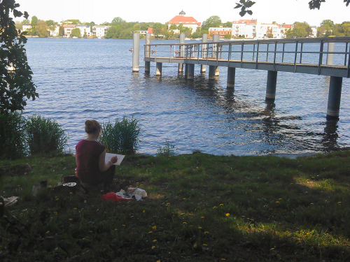 Auch das Projekt Malerei - "Die Landschaft und Ich" konnte in der Projektwoche durch den Förderverein mitfinanziert werden. Im Bild 3 wird gerade im Park Babelsberg mit Acryl auf Spanplatte gemalt.
