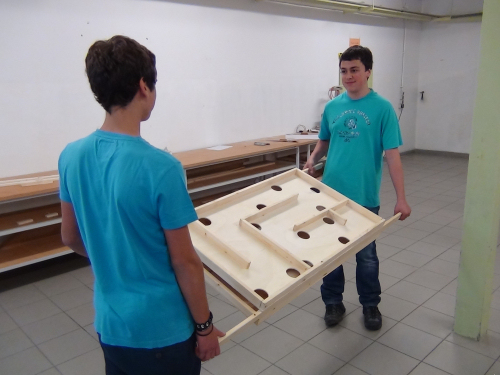 "Historische Spiele - selbst gebaut" - Pascal und Sanny im Bild 5 bei der Präsentation ihres hölzernen Geschicklichkeitsspiels. Weitere Exponate jugendlicher Handwerkskunst - Puppenhaus, Vogelhaus - entstanden gleichfalls.
