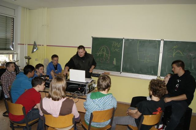 Ein Profi im Bereich Corporate Design kam an unsere Schule, um mit den MitarbeiterInnen der Schülerfirma das Layout zeitloser, aussagekräftiger Firmen-Plakate zu erlernen bzw. zu professionalisieren. An zwei Tagen entstanden gemeinsam mit Andreas Naurath mehrere Entwürfe, von denen nun zwei Plakate in A1 gedruckt und zu Messen mitgenommen werden können (Bild 1). Silvio Schneider (selbständiger Licht- und Tontechniker) konnte in dieser Projektwoche in Theorie und praktischen Übungen enorm viel Wissen und Fähigkeiten an die 12 Mädchen und Jungen der Ton & Film SGmbH herantragen. Ermöglicht wurde dieser Workshop gleichfalls durch die finanzielle Unterstützung der Servicestelle Schülerfirmen. In einem Abschlusstest konnten 8 MitarbeiterInnen den Technikführerschein ablegen. Diese Qualifikation kann nun ein noch besseres Gelingen unseres Veranstaltungsservices absichern (Bild 2).