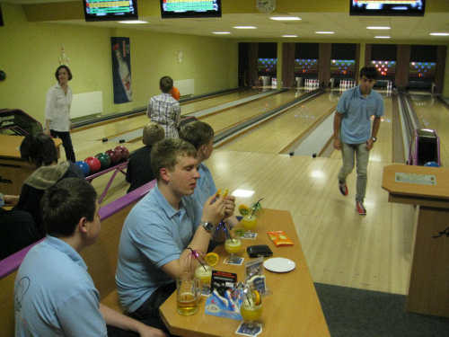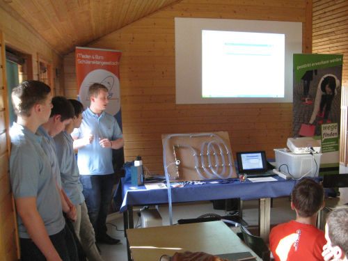 Die Technologiestiftung fördert dieses Projekt mit 40000,00€. Die Medien & Büro Schüleraktiengesellschaft beteiligt sich mit einer stundenplanabhängigen Heizungssteuerung für die Räume der Lenné-Schule. Am ersten Tag wurden mehrere Workshops angeboten. In Bild 1 stellen Aaron und Felix gerade eine Farbstoffzelle aus Hibiskustee her. Die 6 cm2 große Zelle schaffte es bei 100 Lumen Lichteinstrahlung (sonniger Tag) auf 0,04 bis 0,1 W elektrischer Leistung. Am Ende des ersten Tages wurden soziale Kontakte zwischen den beteiligten Projektgruppen gepflegt. Im Bowling-Center ließen es sich alle gut gehen (Bild 2). Ein wirkliches Highlight war am zweiten Tag die Projektmesse. Alexander, Richard, Aaron und Felix konnten anhand des selbst gebauten, voll funktionsfähigen Modells ihrer intelligenten Heizungssteuerung eindrucksvoll die Projektidee transportieren und ihr hohes ingenieurtechnisches Niveau unter Beweis stellen.
