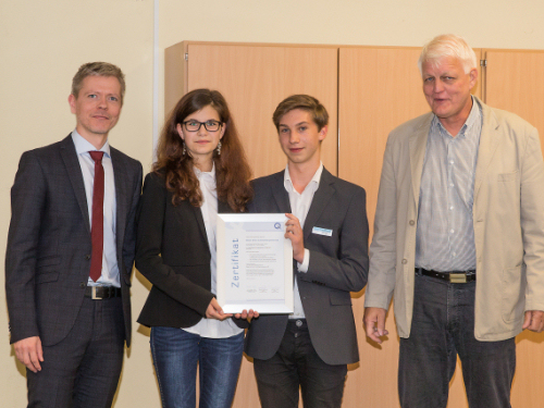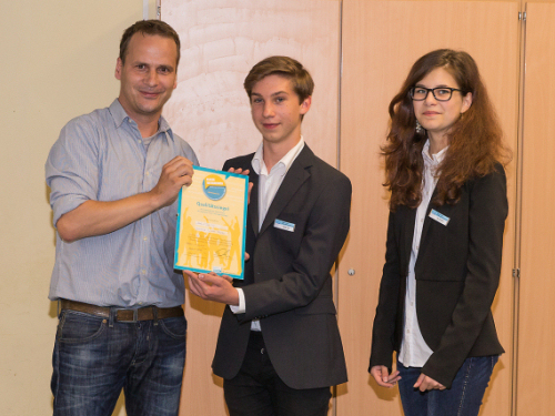 Neben Herrn Bothe von der Servicestelle Schülerfirmen waren Herr Danneberg vom Unternehmerverband Brandenburg-Berlin e.V. sowie Herr Neuschulz und Herr Plank als Auditoren von der EuroNorm GmbH anwesend. Nach dem Jahresbericht konnte die Schülerfirma mit dem Qualitätssiegel der Deutschen Kinder- und Jugendstiftung ausgezeichnet werden - Lisa und Daniel nehmen es im Bild 1 von Herrn Bothe entgegen.
