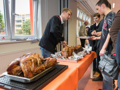 Nach der Aktionärsversammlung kamen Gäste und MitarbeiterInnen bei einem ausgedehnten Abendessen auf der Grundlage von 25 kg Spanferkel, 15 kg Pute sowie gekühlten Getränken ins Gespräch. Als die meisten Gäste den Heimweg angetreten hatten, hielten es die letzten MitarbeiterInnen von insgesamt drei Schülerfirmen am Lagerfeuer bis morgens 5.00 Uhr aus. Eine Stunde später waren die frischen Brötchen vom Bäcker geholt und der Frühstückstisch gedeckt.