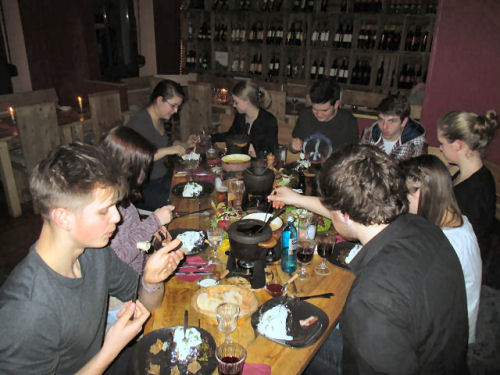 Lisa, Merle, Friederike und Maximilian konnten sich am ersten Tag gemeinsam mit ca. 50 anderen Schülerfirmen u.a. auch aus Polen, England und Schweden einige Tipps für die Gestaltung eines Messestandes von Profis erklären lassen. Das Deutschlandradio interessierte sich in besonderem Maße für die Arbeit der Medien & Büro SAG. Am zweiten Tag gab es wirklich viele intensive Gespräche sowohl mit interessierten SchülerInnen als auch mit LehrerInnen, die selbst eine Schülerfirma an ihrer Schule aufbauen wollten (Bild 1). Zum zweiten Mal durfte die Ton & Film Schüler-GmbH teilnehmen. Melany, Annabell, Felix, Florian und Nikolaus erlebten wirklich viele intensive Gespräche sowohl mit interessierten SchülerInnen als auch mit LehrerInnen, die über die Vielfalt der Betätigungsfelder in der vorgestellten Schülerfirma staunten (Bild 2). Die MitarbeiterInnen beider Schülerfirmen ließen den ersten Tag der Messe im Fondue-Restaurant "Ars Vini" sowie am Billiard-Tisch der Bar des "Singer 109" ausklingen - ein weiterer anstrengender Messetag wartete... (Bild 3)