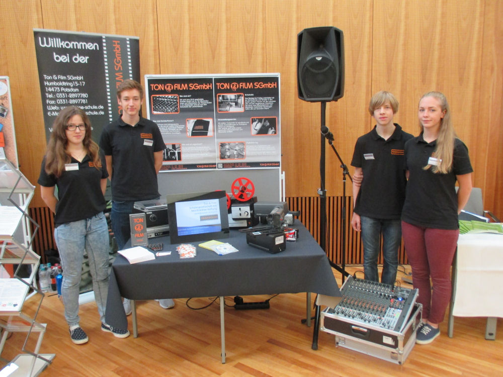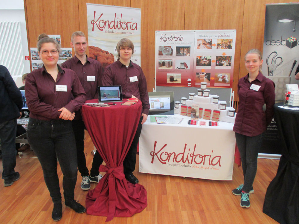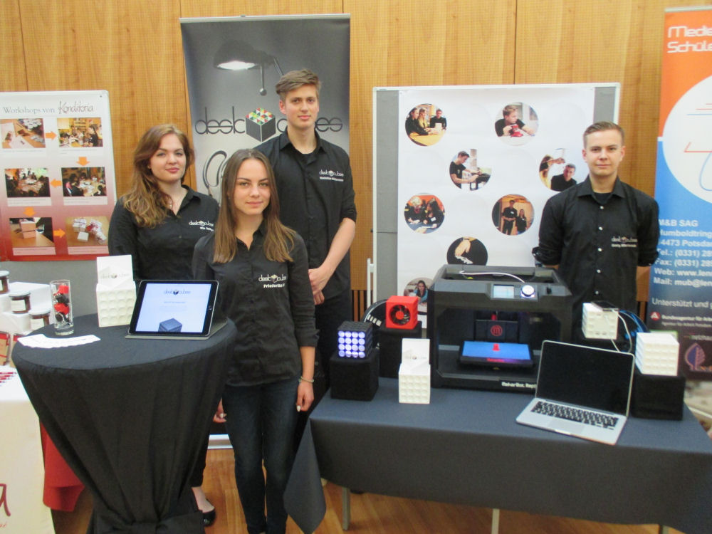 Catriona, Daniel, Fabian und Anna-Lena erklärten an ihrem Messestand vielen Besuchern die Geschäftsidee der Medien & Büro Schüler-Aktiengesellschaft (Bild 1). Ganz besonders erstaunt waren viele Interessenten von der Professionalität im Bereich Netzwerke und Grafikdesign. Luna, Anton, Erik und Annabell konnten sehr bildhaft die Gründung der Ton & Film Schüler-GmbH basierend auf dem Schulradio der Lenné-Schule erklären (Bild 2). Besonderes Interesse fanden die Ideen rund um die Digitalisierung analoger Bildmaterialien wie Dias und Videobändern. Merle, Justus, Peter und Lisa präsentierten das Ergebnis ihres Seminarkurses "Berufs- und Studienvorbereitung" in der Abiturstufe (Bild 3). Es ist gerade einmal ein Jahr der Arbeit im Schülerunternehmen Konditoria vergangen, schon erhielten sie für die Idee, Kuchen im Glas zu vermarkten und Workshops dazu anzubieten, den zweiten Platz im Landeswettbewerb der JUNIOR-Unternehmen. Das JUNIOR-Unternehmen DeskCubes stellt aus biologisch abbaubarem Material mit dem 3D-Drucker ein individualisierbares Office-System für den Schreibtisch her (Bild 4). Dazu gehören momentan Ventilatoren, USB-Ladestationen, LED-Cubes sowie Aufbewahrungselemente für Kleinteile. Pia, Friederike, Maximilian und Georg zeigten zum Gründertag Potsdam, was nach knapp einem Jahr in einem Seminarkurs "Berufs- und Studienvorbereitung" erreicht werden kann.