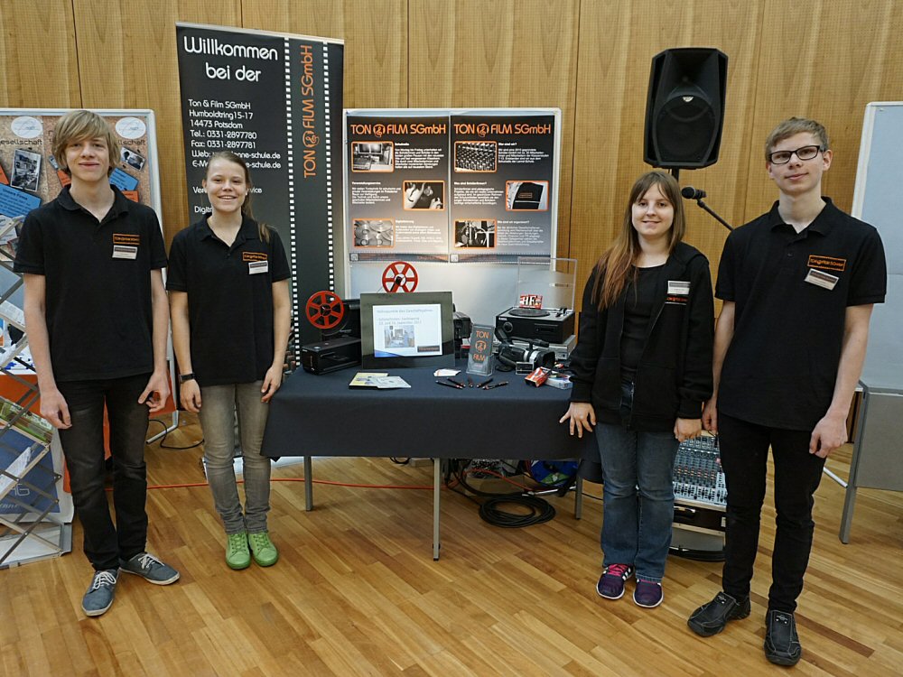 Auch die Ton & Film Schüler-GmbH präsentierte ihr Leistungsportfolio auf dem 10. Potsdamer Gründertag. Josephine, Phöbe, Enrico und Erik erklärten den Messegästen was Schülerfirmen sind und welche Dienstleistungen sie selbst anbieten können. Der Messetag wurde durch viele wertschätzende Gespräche am Messestand für die Arbeit der Jugendlichen begleitet (Bild 2).