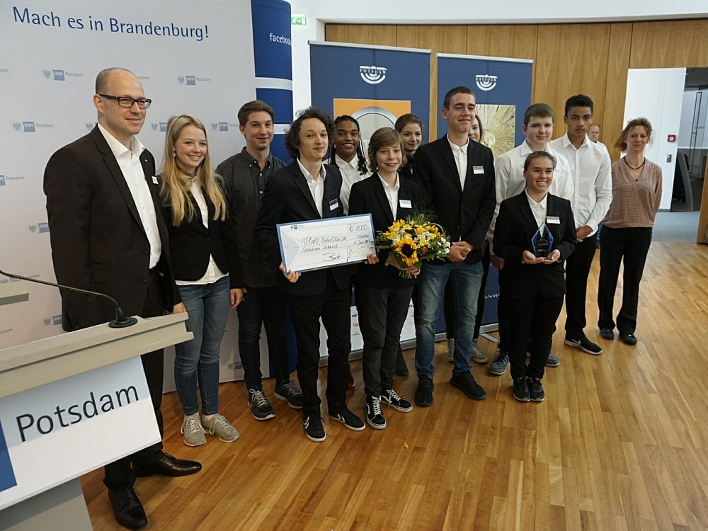 Der vor knapp einem Jahr von der IHK-Stiftung "Fachkräfte für Brandenburg" ausgelobte Schülerfirmen-Wettbewerb "Gemeinsam Ideen bewegen!" fand auf dem Potsdamer Gründertag seinen Abschluss. Aus den Händen des Vorsitzenden des Kuratoriums Herrn Markus Busse konnte die Medien & Büro Schüler-Aktiengesellschaft den mit 1000,00€ dotierten 1. Platz in Empfang nehmen. Jenny, Mina, Tim und Till betreuten an diesem Tag den Messestand.