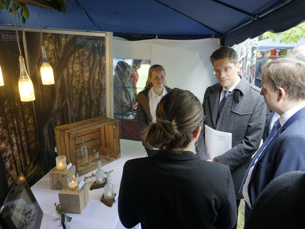 Der den Bundesminister vertretende Parlamentarische Staatssekretär für Wirtschaft und Energie, Christian Hirte, informierte sich auf dem Innovationstag Mittelstand am 9. Mai 2019 in Berlin auch bei den SchülerInnen des JUNIOR-Unternehmens Lichterloh über die Einordnung eines solchen Seminarkurses in das Abitur und notwendige Unterstützungsmechanismen im Allgemeinen und - sichtlich beeindruckt - über die Geschäftsidee, Einwegflaschen aus Glas mittels innovativer Verfahren zu upcyceln im Speziellen (Bild 2). Luna und Antonia scheuten sich nicht, dem ministeriellen Tross fachlich und kommunikativ ihr Können zu demonstrieren.