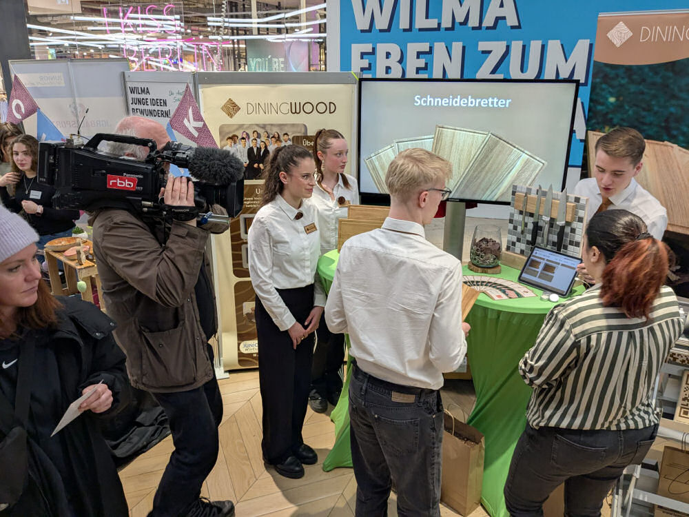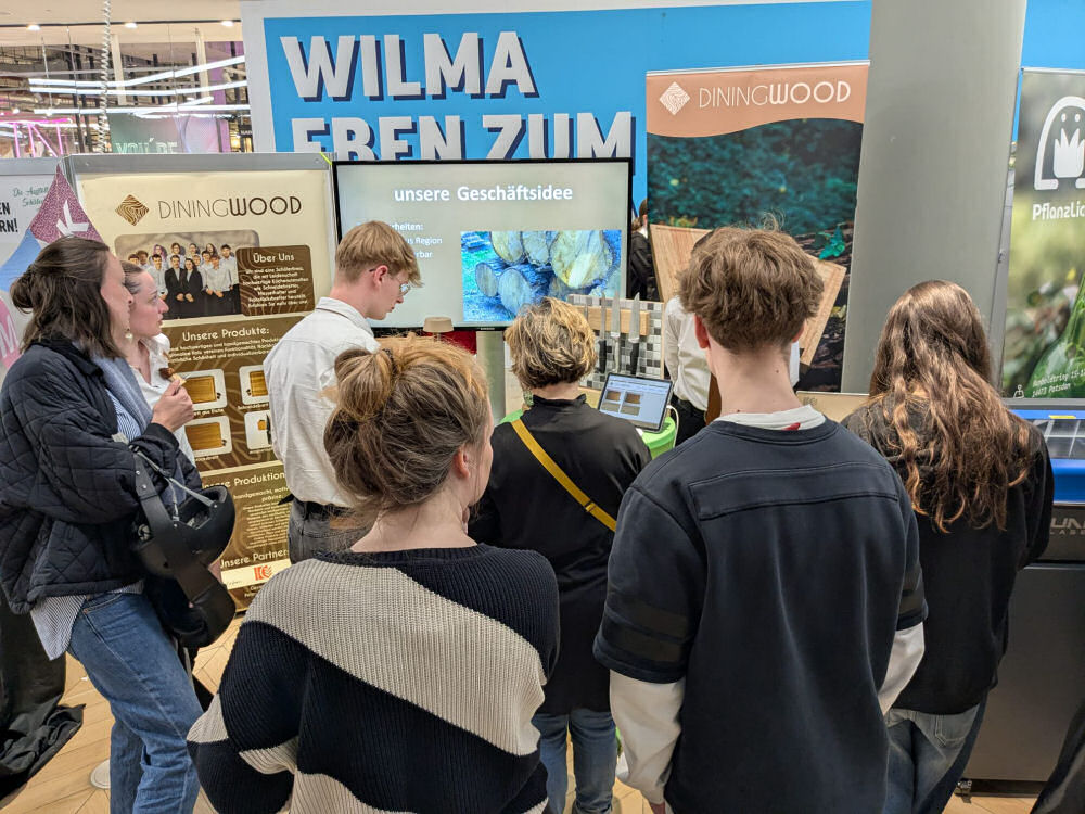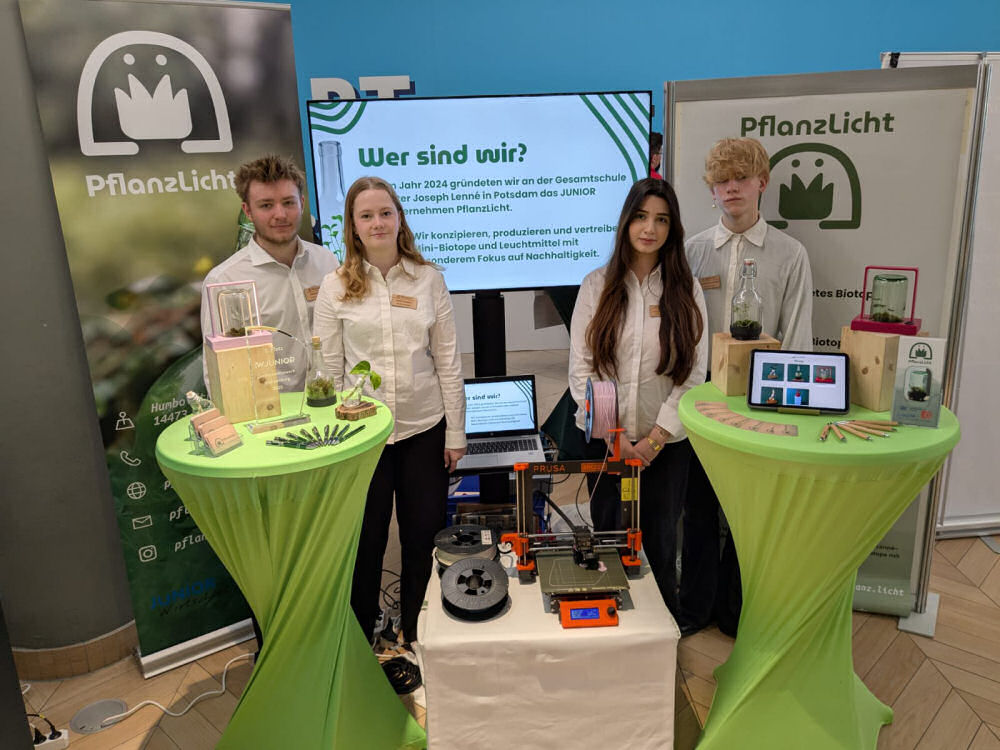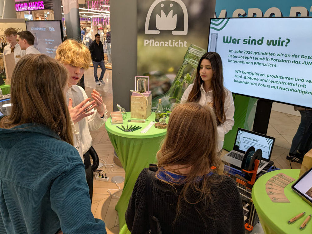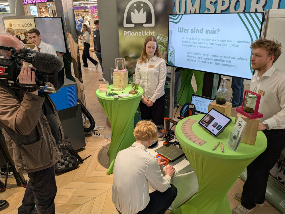 lud am 10. April 2025 nachhaltig wirtschaftende Schülerfirmen in die Wilmersdorfer Arkaden ein. Ca. 20 Schülerfirmen aus Brandenburg und Berlin konnten auf dieser Messe ihre Geschäftsideen vorstellen. Als einzige Schule aus der Landeshauptstadt Potsdam durfte die Lenné-Schule mit den beiden vor sieben Monaten gegründeten JUNIOR-Unternehmen DiningWood und PflanzLicht vor Ort sein. Ein wenig Aufregung kam auf, als der RBB mit einem Filmteam vor den GründerInnen stand. Die Mühe gipfelte allerdings nur in zwei Sekunden Einblendung im Berliner RBB-Abendjournal.