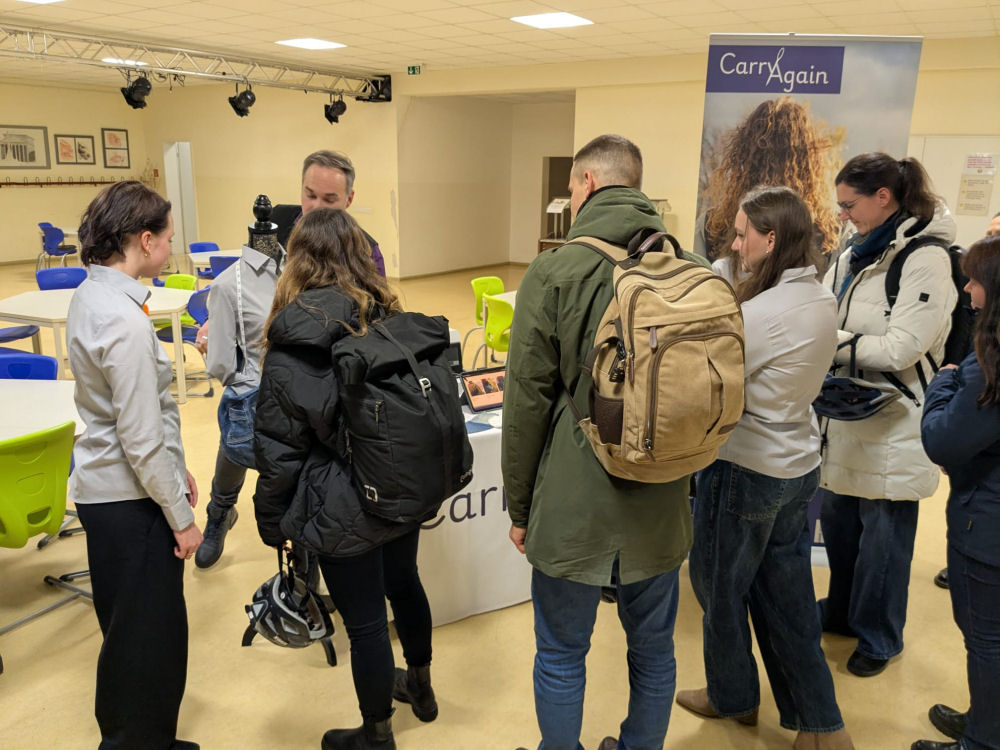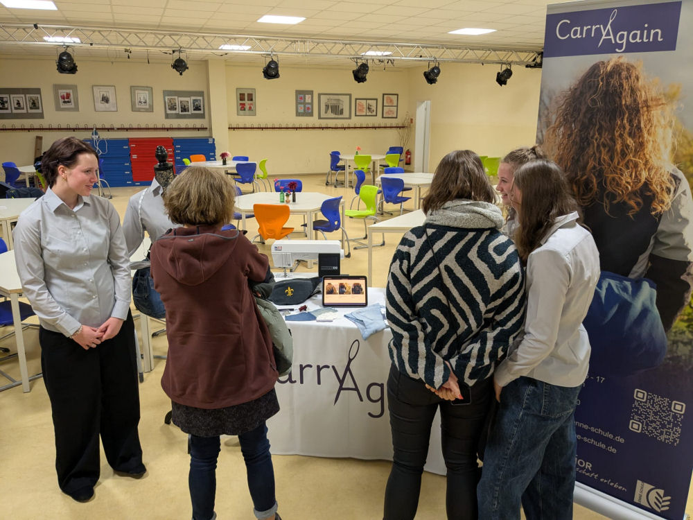 ein JUNIOR-Unternehmen. Die 14 beteiligten SchülerInnen aus dem Jahrgang 12 sind mit der Geschäftsidee angetreten, nachhaltige Textilien anzubieten, die mit unterschiedlichen Verfahren personalisiert werden können. Kern der Produktpalette ist dabei ein Taschensortiment, dass aus gebrauchten Jeans hergestellt wird. Der Name der Schülerfirma CarryAgain ist also Programm.